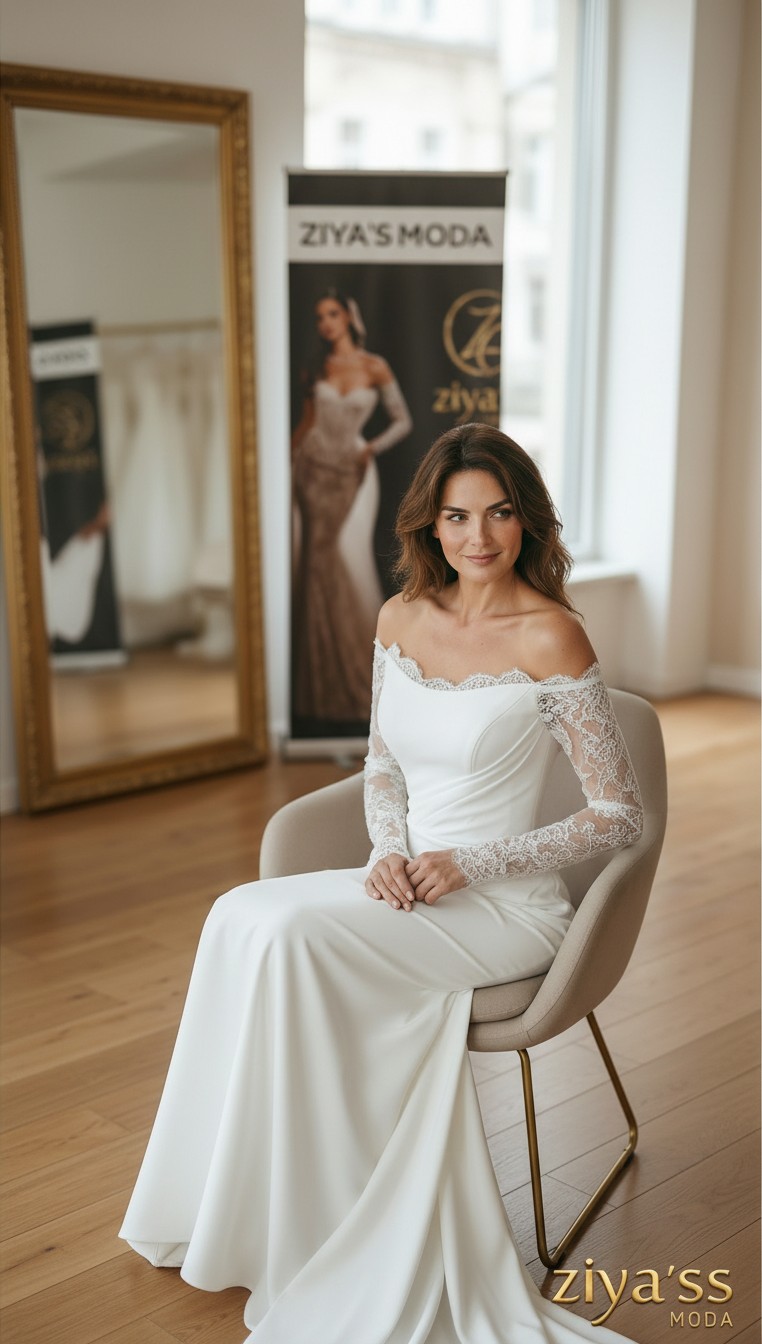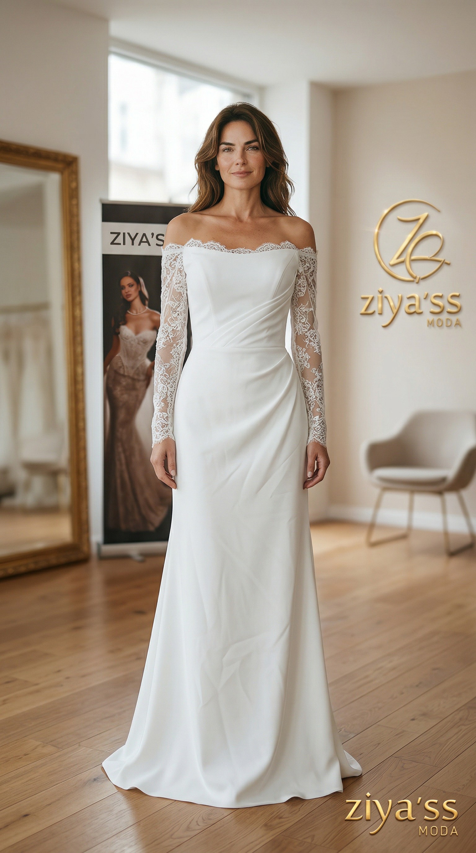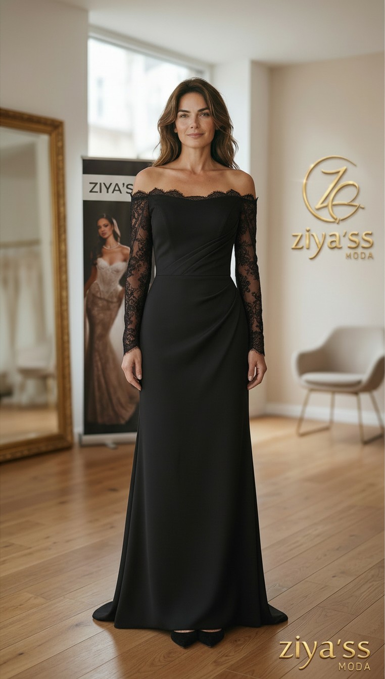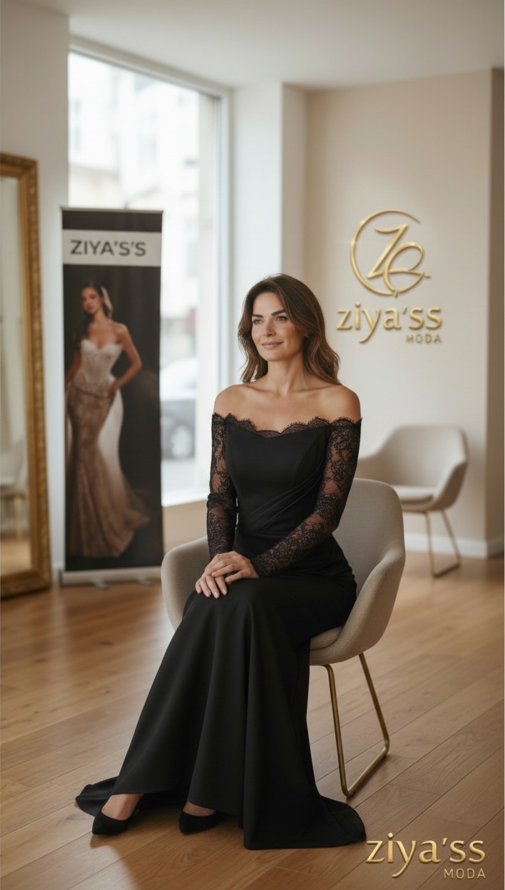 ABİYE STRAPLEZ DANTEL KOLLU MADONNA YAKA SATEN ELBİSE