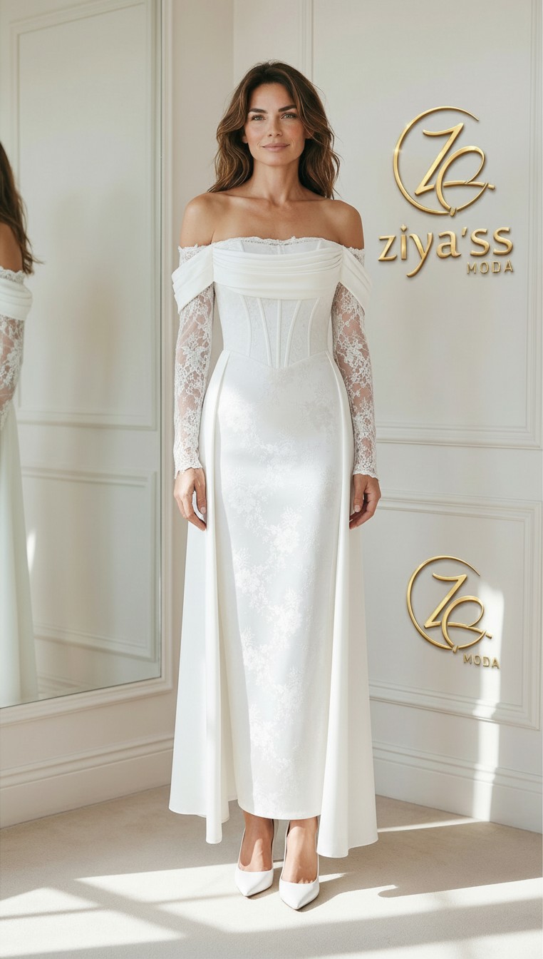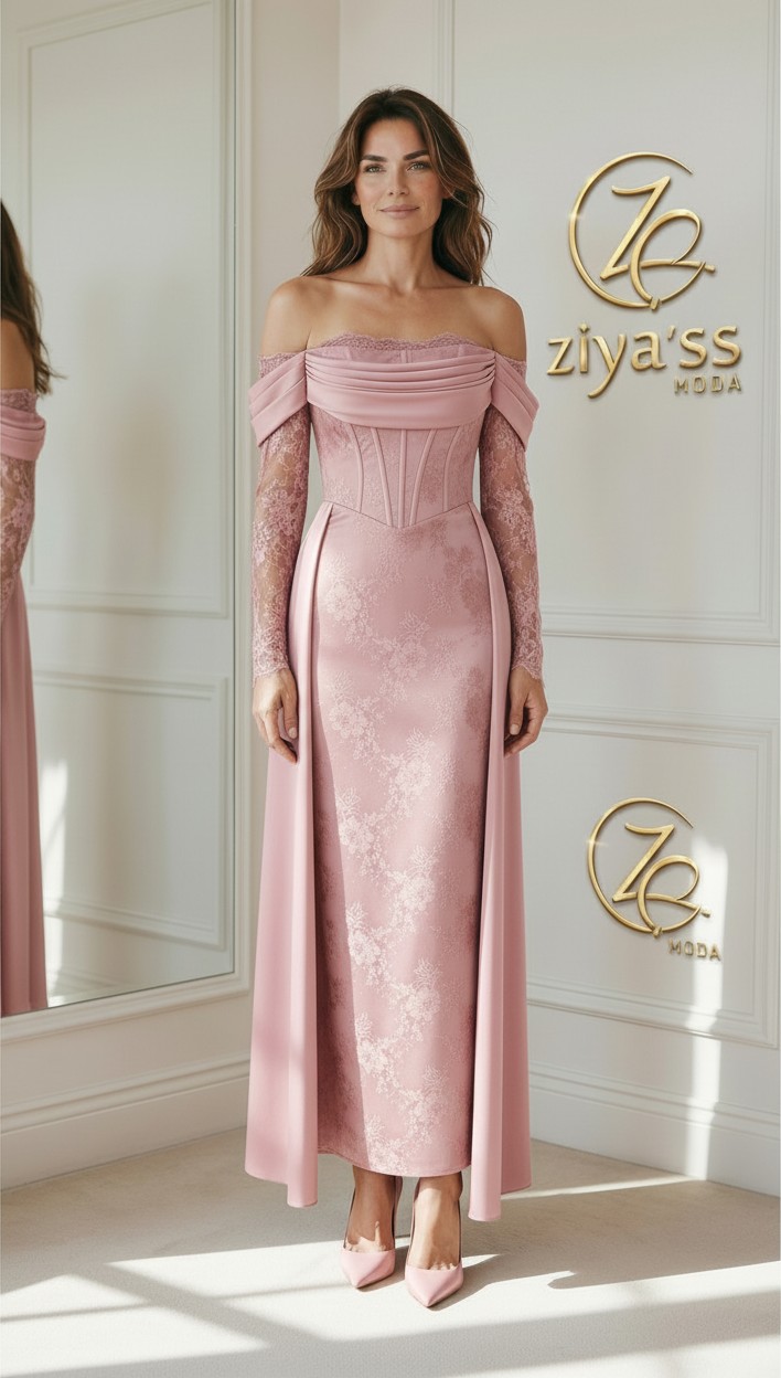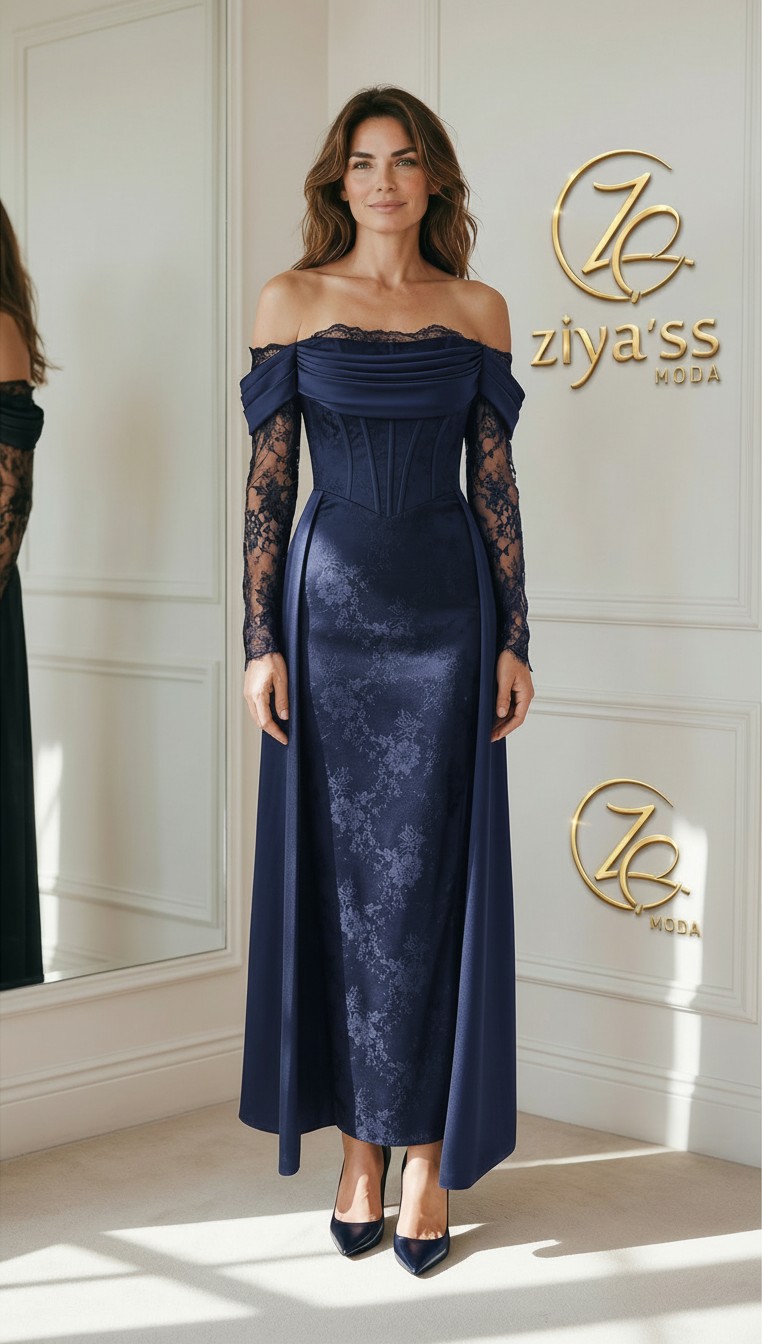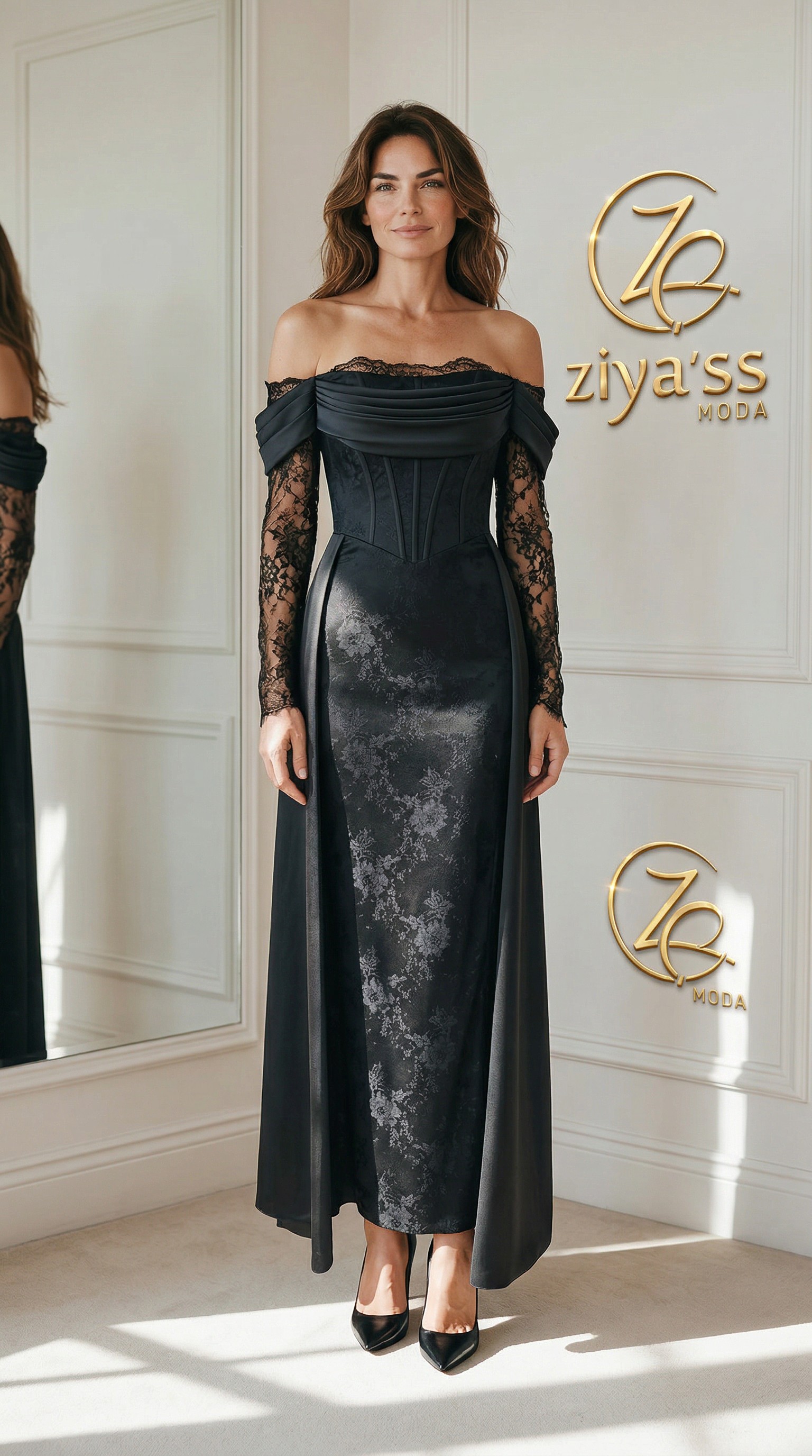 ABİYE STRAPLEZ DANTEL KOLLU MADONNA YAKA SATEN KUYRUKLU ELBİSE